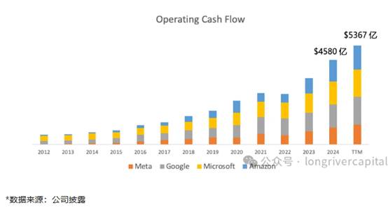 2. 同期,这四家公司的经营性现金流,也就是在分红、回购、还债、投资之前,实打实主营业务所产生的现金流是5357亿,比24年增长了17%。换句话说,过去12个月,堆机器、堆数据中心花的钱占公司经营现金流的比例是3277/5357=61%,即使公司完全不借债,仅靠新增的现金流也完全可以做的起这个投入。但是花钱的增长速度确实比挣钱快。