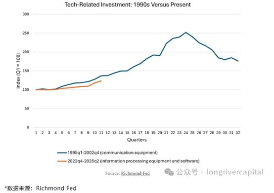 moment到25年2季度,整体科技相关的投资增速仍低于90年代末的泡沫高峰。Jensen最近也在一个FT的采访上说,“During the dotcom era…the vast majority of the fiber deployed were dark meaning the