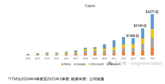 Google, Microsoft 与Amazon这四家,合计资本性投入(用于GPU,数据中心等)3277亿美元,较2024年增长了53%。