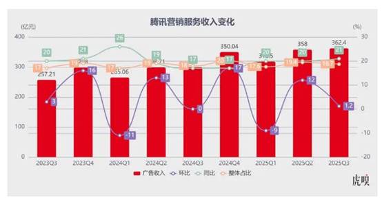 腾讯营销服务收入同比提升 21% 至 362.4 亿元,连续十二个季度保持两位数增速。