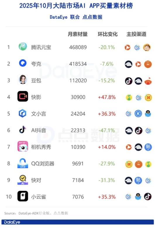 亿元,财报披露主要用于推广 AI 原生应用程序及游戏;但从市场投放表现来看,其中很大一部分用在了元宝的推广投入上:DataEye 数据显示,腾讯元宝在10月的 AI 产品买量位列中国大陆 AI 应用市场 Top1,夸克与豆包紧随其后。