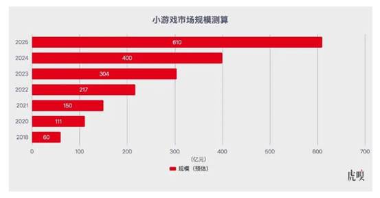 此外,一个隐秘风口在微信与抖音搅动下长出数百亿市场——DataEye 研究院基于小程序游戏国内买量消耗、买量参投情况、备案新增产品情况,以及大厂内测产品布局情况综合判断,预计 2025 年小游戏市场规模或高达 610 亿,较七年前涨了 10 倍。