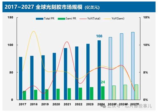 2024年全球光刻胶市场规模108亿美元,其中半导体光刻胶市场规模约24亿美元,预计2025年市场规模持续增长达到114亿美元。未来,光刻胶市场规模稳步成长,预计2027年光刻胶市场规模达125亿美元,半导体光刻胶市场规模达28亿美元,年复合增长率达4%。