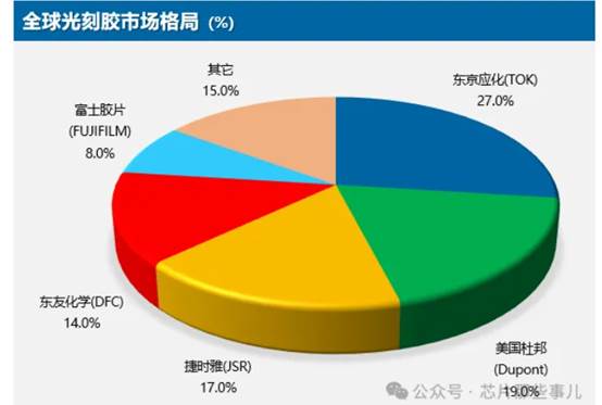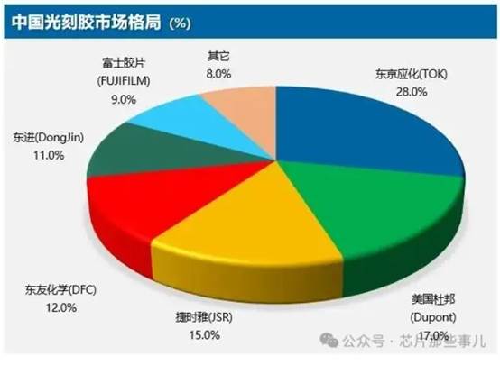 光刻胶供应被美日企业垄断,前五大厂商市场份额高达85%,前五厂商分别是东京应化、杜邦、捷时雅、东友化学(住友全资子公司)、富士胶片,其中四家来自日本。而在半导体光刻胶领域,市场基本被日系厂商垄断,东京应化、信越化学、东友化学、富士胶片四家日企市场份额近七成。