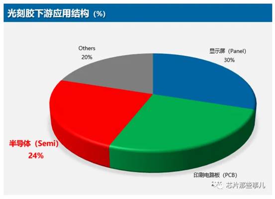 光刻胶主要下游应用包括:显示屏制造、印刷电路板生产、半导体制造等,其中显示屏是光刻胶最大的下游应用,占比30%。光刻胶在半导体制造应用占比24%,是第三大应用场景。