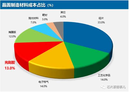 光刻胶占晶圆制造材料总成本约13%,成本占比是仅次于硅片、电子特气、工艺化学品。作为晶圆制造的核心材料,在晶圆制造过程中反复使用。光刻胶通过与光刻机共同作用,在晶圆上形成电路阵列图案,是电路阵列图案形成的关键。
