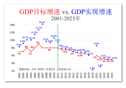 在开始之前,我想与大家分享我绘制的一张新图。这张图对比了中国政府设定的GDP增长目标和实际实现的GDP增长率。我用绿色虚线将2001—2025年这个时期一分为二,2001—2011年是前一个时期,2012年至今是后一个时期。