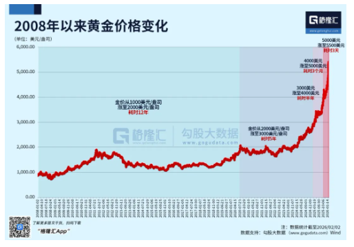 1月26日,黄金价格首次突破5000美元大关后,随后三个交易日,金价连破五道百元大关,冲破5500美元。