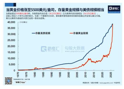 这波黄金行情启动于2024年3月,然后就开始了历史几乎没有见过的疯狂上涨。2024年涨幅26.66%,2025年涨幅63.68%,然后26年短短一个月涨28%,到2026年1月29日,黄金触达5598.88美金/盎司,此时的黄金总价值(38.2万亿美元),已不但是人类第一大资产,且已与疯狂人类数百年举债峰值的美债规模(38.5万亿美元)旗鼓相当!这是上世纪八十年代以来的首次!