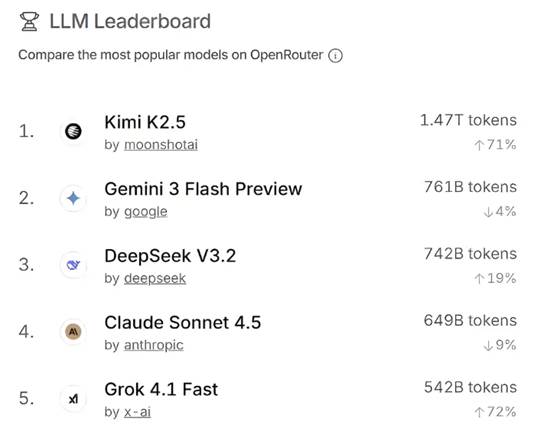 Kimi K2.5发布后,迅速在OpenRouter榜单上冲到TOP1,超越Gemini 3、Claude Opus 4.6等海外顶流模型。