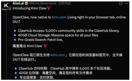 如果说Kimi K2.5是强大的“大脑”,那么春节期间上线的Kimi Claw,就是让这个大脑“活”起来的关键。