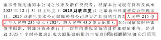 公司在2026年3月6日发布盈利警告,预计2025财年归母净亏损约215亿至235亿元!而2024年亏损仅约43.5亿元。