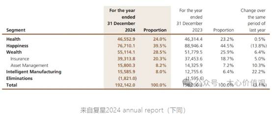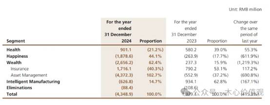 但利润结构并不漂亮。2024年Health板块归母利润约9.01亿元,Happiness板块亏18.79亿元,Wealth板块亏26.56亿元,Intelligent Manufacturing亏6.27亿元,集团整体归母亏损43.49亿元。