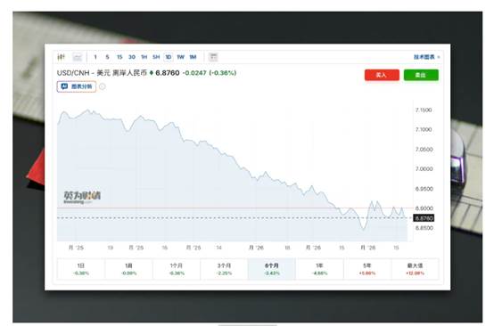 果真,去年年底我们就看到人民币开始破7了。截至2026年3月,离岸人民币已进一步升值至6.89-6.90区间,创近三年新高。